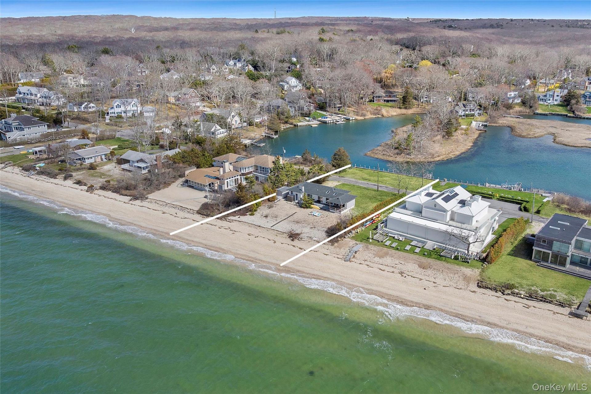 A rare dual-waterfront opportunity in Southampton, this unique property offers direct frontage on both Little Peconic Bay and Fresh Pond, creating an exceptional setting with water on either side. With approximately 111 feet of private sandy beach on the bay and a protected bulkhead with dock, the property provides immediate access to open water while also offering a more sheltered environment for boating and watersports. Enjoy long summer days on the beach with swimming, paddleboarding, and kayaking, followed by sunset views over Little Peconic Bay. From your dock, set out with ease to explore nearby destinations including Sag Harbor, Shelter Island, Robins Island and the North Fork. The existing single-story home features three bedrooms and two baths, with an open living, dining, and kitchen area oriented toward the water. Whether enjoyed in its current form or thoughtfully updated over time, the property also offers significant potential to expand or create a custom residence that fully takes advantage of its rare setting. Situated within a desirable waterfront community just minutes from Water Mill and Southampton Village, this offering presents a compelling opportunity for builders, investors, or end users seeking a unique combination of bayfront beach and protected dockage in the Hamptons.